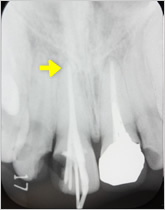 - 再度根管治療を行い、根の内部から膿の袋に直接薬を作用させている。