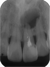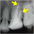 - 根管充填剤が根尖(根の先端)まできっちりと充填されている。術前に存在した大きな膿の袋は消失してきている。
